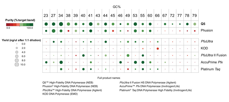 PCR was performed with a variety of amplicons, with GC content ranging from high AT to high GC, with Q5 and several other commercially available polymerases. All polymerases were cycled according to manufacturer's recommendations, including use of GC Buffers and enhancers when recommended. Yield and purity of reaction products were quantitated and represented, as shown in the figure key, by dot color and size. A large dark green dot represents the most successful performance. Q5 provides superior performance across the range of GC content.