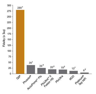 Q5® High-Fidelity DNA Polymerase (NEB #M0491) sets a new standard for both fidelity and robust performance. With the highest fidelity amplification available (>280 times higher than Taq), Q5 DNA Polymerase results in ultra-low error rates. Q5 DNA Polymerase is composed of a novel polymerase that is fused to the processivity-enhancing Sso7d DNA binding domain, improving speed, fidelity and reliability of performance.