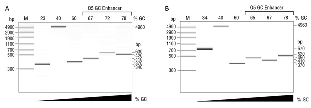 Amplification of a variety of human genomic amplicons from low to high GC content using either Q5 or Q5 Hot Start High-Fidelity DNA Polymerase. Reactions using Q5 Hot Start were set up at room temperature. All reactions were conducted using 30 cycles of amplification and visualized by microfluidic LabChip® analysis.